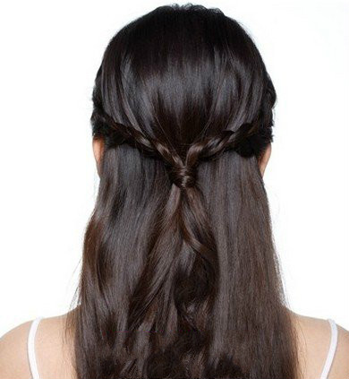 黑色的韩式编发发型,因为通过从两边开始就弄成的公主辫发型,直接交错并且用发夹固定,一样塑造了精致的美感。