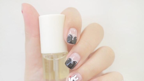 3.在大拇指上用白色指甲油画一个兔子造型,并用黑色指甲油勾边,再画出眼睛和嘴巴。