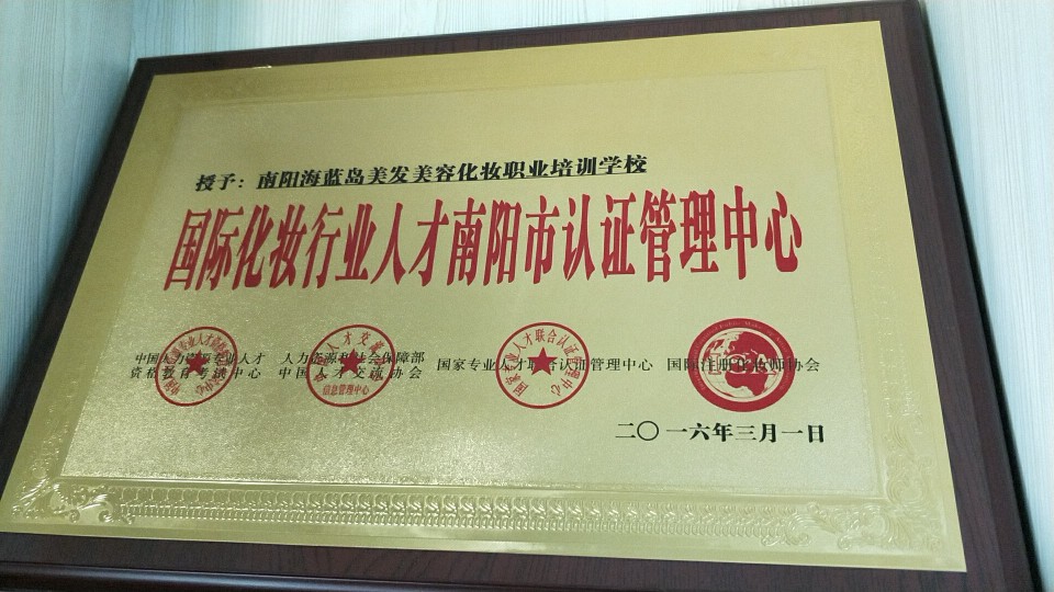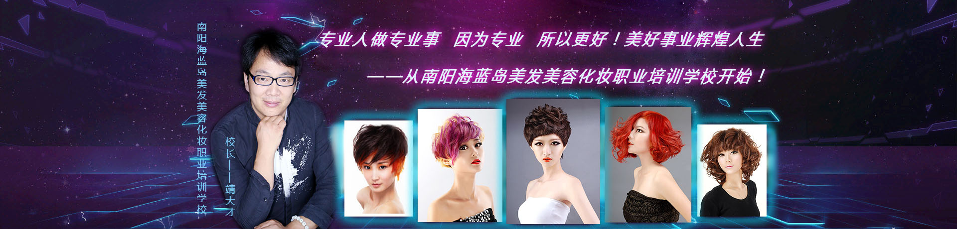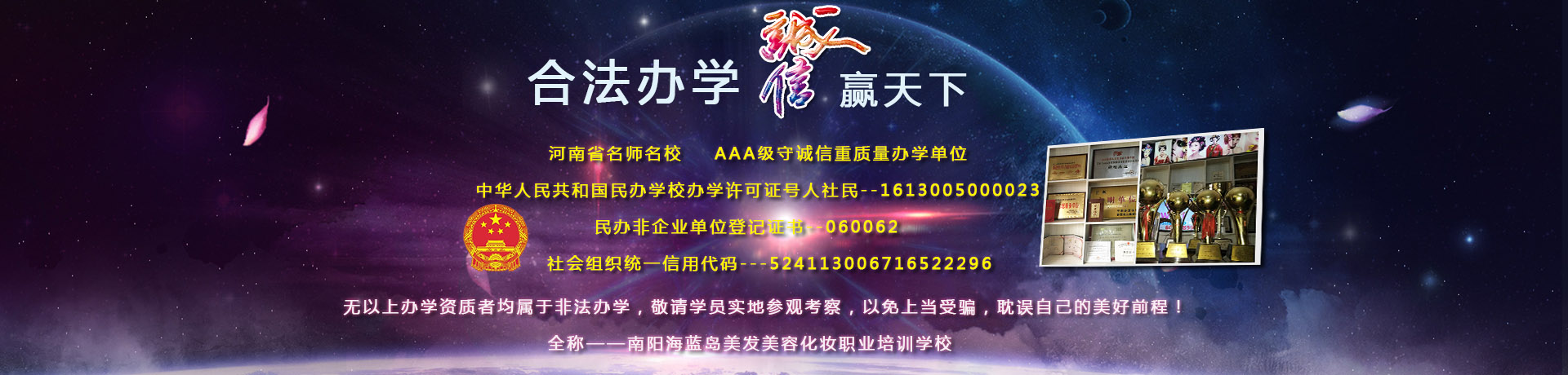 在南阳长途汽车站南300米中韩技术联盟全国连锁行业精英,荣获《推动中国美发美容化妆行业特殊贡献奖》《中国金剪刀美发造型名师》《河南省美发美容化妆行业名校》属国家劳动和社会保障部在1996年批准开办的豫西南最早的正规专业美发美容美甲化妆培训学校,中国美发美容协会,中华美业第一赛中韩技术交流合作单位。南阳市美发美容协会会长单位。南阳最专业最权威的美发学校海蓝岛名师名校!南阳美发美容化妆学校。