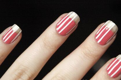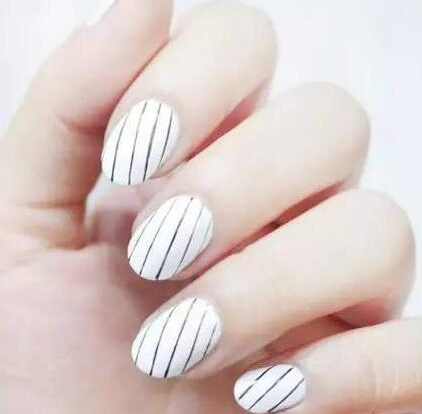 众所周知,胖人穿竖条纹的衣服有助于显瘦,拉长身型,同理,竖条纹美甲也可以从视觉上拉长你的手指。喜欢简约一些的,可以尝试左边的白+黑竖线美甲,喜欢卡哇伊一点的,右边的白色竖条纹+粉色玫瑰花法式美甲是个不错的选择哦!