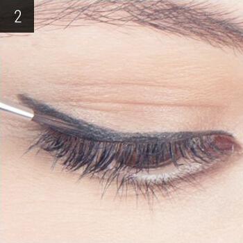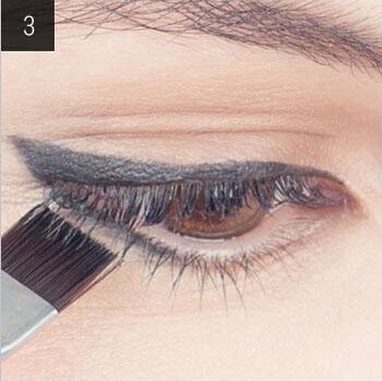 Step2:用眼线刷蘸取黑色眼线膏,画一条黑色上眼线,眼尾加粗上扬。