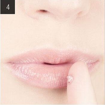 Step4:将粉色唇蜜点在指腹,由指腹在嘴唇轻轻按压上色,让色泽饱满更诱人。