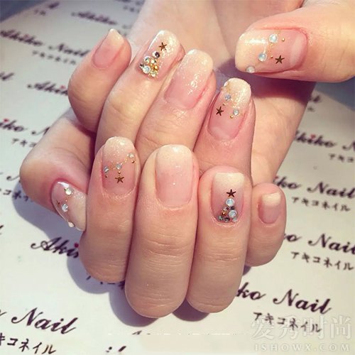 肉粉色和白色的美甲真女神,装饰了水钻就更加有个性。
