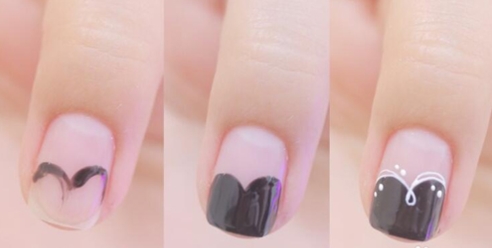 2.在食指、中指和小拇指的指尖用黑色指甲油画半个爱心形状,最后用美甲勾画笔蘸取白色指甲油沿着爱心勾边,并用小圆点进行点缀。